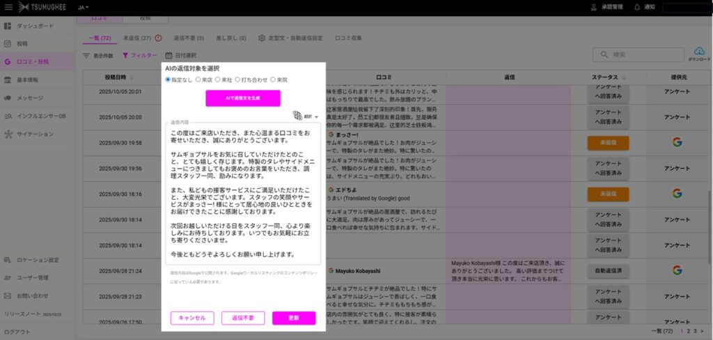 一般ユーザーからの口コミを一覧で確認、返信が行えます。