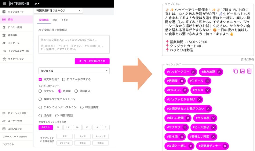 AIがキャプションを自動で作成します。口コミやロケーションのカテゴリーを見て自動学習し、投稿を作成します。お勧めのハッシュタグまで提案してくれます。